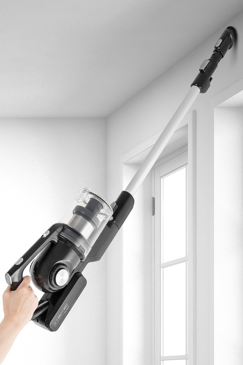 Belaidis TROTEC dulkių siurblys -šluota „2-in-1“: belaidis vertikalus dulkių siurblys ir kompaktiškas rankinis dulkių siurblys su galinga ciklono technologija, HEPA filtru ir LED apšvietimu.