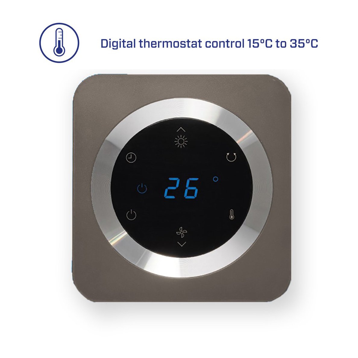 Aiškiai išdėstytame skaitmeniniame valdymo skydelyje ventiliatoriaus – šildytuvo viršuje yra šeši jutikliniai mygtukai, leidžiantys lengvai pasirinkti norimus nustatymus. Be to, šildytuvo ventiliatoriuje taip pat yra nuotolinio valdymo pultas.