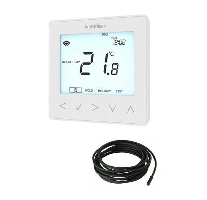 <p style="text-align: justify;">Elektrinio grindinio &scaron;ildymo <strong>programuojamas termostatas</strong> Heatmiser neoStat-e V2 suteikia Jums i&scaron;manesnį būdą valdyti elektrinio grindinio &scaron;ildymo sistemą. Sujungus &scaron;į termostatą su i&scaron;maniąja dėžute Heatmiser neoHub (parduodama atskirai), Jūs galėsite nuotoliniu būdu valdyti elektrinio grindinio &scaron;ildymo sistemą. <strong>Programuojamas termostatas</strong> Heatmiser NeoStat-e V2 yra tiekiamas kartu su 3 metrų ilgio nuotoliniu grindų jutikliu ir gali persijungti iki 16A bei susisieti su i&scaron;maniąja dėžute bei kitais &bdquo;neoStats&ldquo; tipo prietaisais jūsų namuose. Tokiu būdu galima sukurti visi&scaron;kai valdomą namų &scaron;ildymo tinklo sistemą.&nbsp;</p>