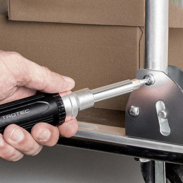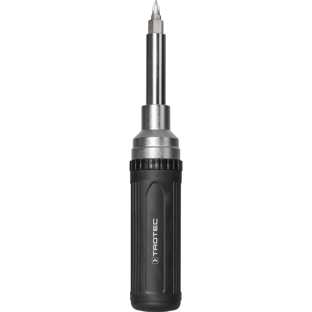 Tvirtas, aukštos kokybės ergonomiškas atsuktuvas Trotec „9 IN 1“ tiks įvairiems buities darbams. Kad atsuktuvas tarnautų ilgai ir pateisintų lūkesčius, plokščio atsuktuvo antgalius (4 mm, 5 mm, 6 mm) reiktų naudoti lengvesniems montavimo, surinkimo, medienos apdirbimo ar restauravimo darbams. Kryžminio atsuktuvo antgalius (PH0, PH1, PH2) galima naudoti remontuojant dviračius, motociklus, elektroninius prietaisus. Šešiakampės atsuktuvo galvutės (1/4", 5/16", 3/8") puikiai pasitarnaus dirbant su universaliais medienai arba metalui tinkančiais varžtais.