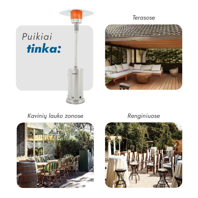 A very important feature of this heater is that its body is made of stainless steel. For this reason, the heater is more resistant to outdoor conditions, rain, and does not rust.