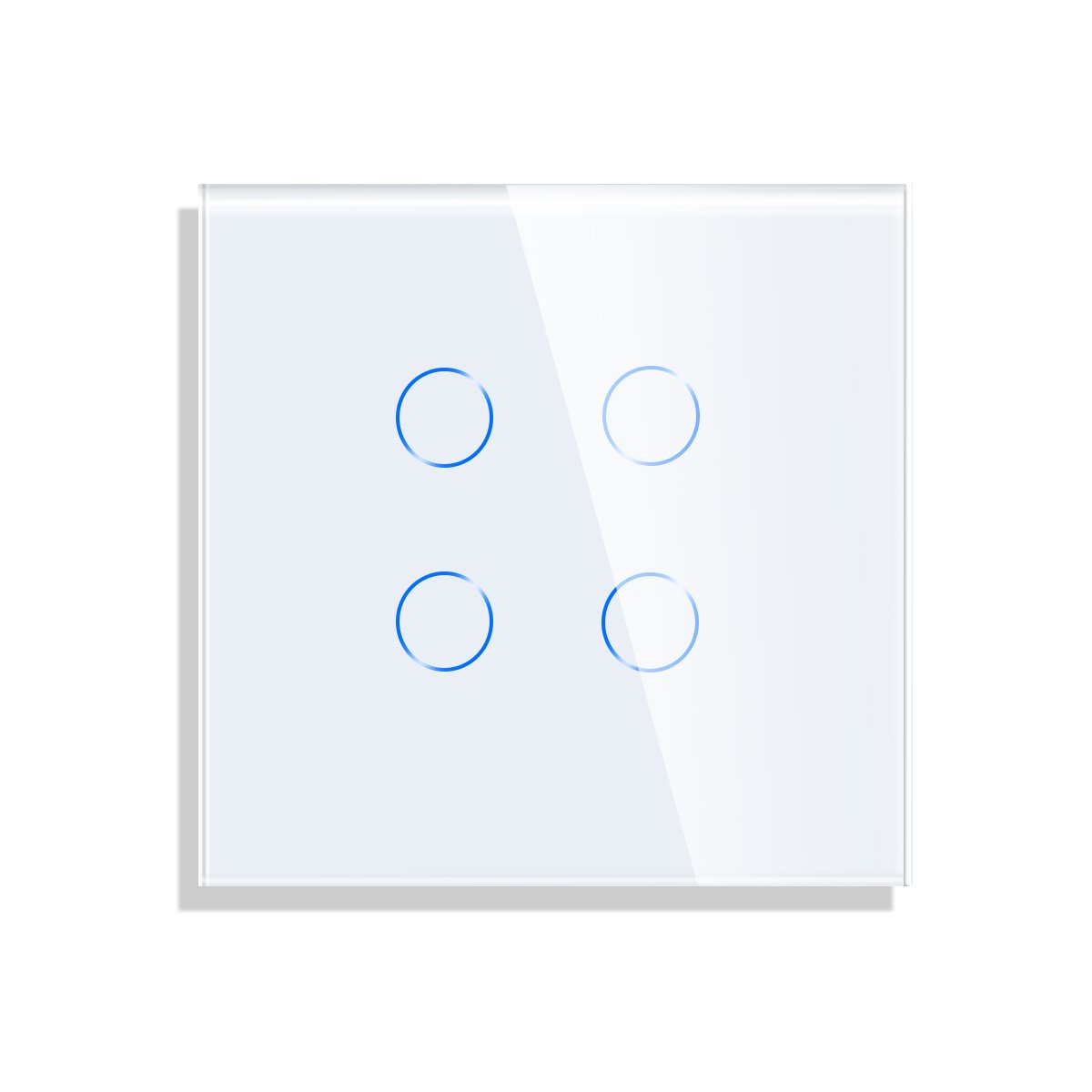 Baltos spalvos stiklinis 500 W sensorinis keturpolis jungiklis Feelspot (komplektas). Baltos spalvos stiklinis sensorinis keturpolis jungiklis pagamintas iš grūdinto stiklo, yra atsparus vandeniui ir ugniai. Aukštos kokybės prietaisas leis mėgautis patogiu valdymu bei paprasta priežiūra. Su modernaus dizaino jungikliu vienu prisilietimu galėsite valdyti apšvietimą patalpoje tada, kada labiausiai to reikia. Keturpolis sensorinis jungiklis Feelspot turi įmontuotą LED indikatorių, kuris rodo kada šviesa yra įjungta/išjungta, o tai padės lengvai rasti jungiklį tamsoje. Paprasto valdymo ir patikimo veikimo keturpolis sensorinis jungiklis Feelspot įgyvendins įvairiausius techninius ir interjero dizaino sprendimus, atitinkančius išrankiausio kliento poreikius.