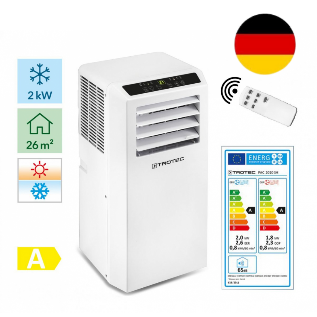 With the Trotec PAC 2010 SH combined air conditioner and heater, you can enjoy a comfortable room temperature all year round! Mobile air conditioner Trotec PAC 2010 SH greitai ir efektyviai cools on hot summer days, using 2 kW of electricity and warms room air on cool autumn evenings, using 1.8 kW of electricity. Mobile air conditioner Trotec PAC 2010 SH puikiai atliks savo funkcijas namuose, biuruose, verslo patalpose, sodo nameliuose, viešbutyje ar restorane, kurių plotas yra iki 26 m², 65 m³ tūrio. Ypač efektyviam energijos taupymui kompresorius automatiškai išsijungia tiek šildymo, tiek aušinimo metu, kai pasiekiama norima temperatūra.