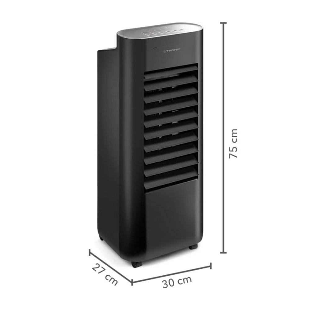 Air cooler Trotec PAE 22 greitai ir efektyviai atvėsina patalpas iki 24 m² arba 60 m³ dydžio, todėl puikiai pasitarnaus miegamajame, svetainėje, vaiko kambaryje ar bet kurioje kitoje patalpoje. Priešingai nei oro kondicionieriuose, air cooler nereikalauja jokio aušinimo skysčio – tiesiog pripildykite įrenginį vėsaus vandens. Norėdami išgauti itin šaltą oro srovę, į vandenį įdėkite atvėsintus ledo paketus (pridedama komplekte) arba ledo kubelius! Dėl kompaktiško vėsintuvo dydžio ir jame integruotų ratukų bei rankenos nekils problemų ieškant pakankamai vietos, o esant poreikiui, bet kuriuo metu įrenginį galėsite perstumti į kitą vietą. Stilingas juodos spalvos vėsintuvas derės bet kuriame namų interjere! Dar vienas svarbus privalumas, kad šiam oro vėsintuvui nereikia išmetimo žarnos (tarpinės), kuri mobiliose oro kondicionavimo sistemose turi būti montuojama prie lango.