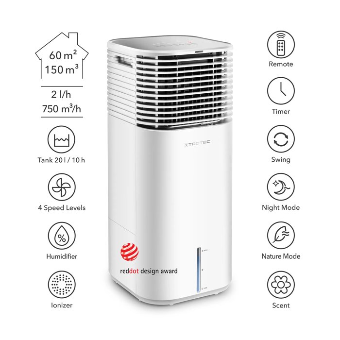 The device also has four fan speeds, which also provide soothing freshness when used as a fan, even when the cooling function is not active. For maximum cooling, we recommend placing two ice packs included in the package in the water tank or using ice cubes. Thanks to the integrated honeycomb structure evaporation filter, this air cooler not only humidifies and cools, but also purifies the air from dust, bacteria, animal hair and pollen, which is why the Trotec PAE 49 will be especially popular with people with allergies.