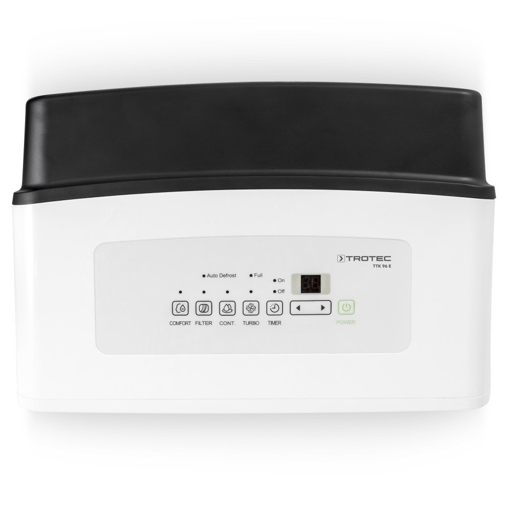Be to, šiame oro sausintuve visos komforto klasės funkcijos montuojamos kaip standartinė įranga: laikmatis, dviejų lygių ventiliatorius, apsauga nuo išsiliejimo bei automatinio išjungimo funkcija ir lengvai išimamas ir plaunamas oro filtras. Šį daugybės funkcijų sąrašą užbaigia drenažo jungtis, leidžianti prietaisui neprižiūrimai ir nepertraukiamai veikti. Tvirto ir kompaktiško oro sausintuvo veikimą užtikrina iki 30 litrų per dieną sausinimo galia. Trotec TTK 96 E turi hidrostato valdomo automatinio sausinimo funkciją, kuri leidžia iš anksto pasirinkti numatytą drėgmės vertę, kurią prietaisui reikia pasiekti. Šis oro sausintuvas Trotec TTK 96 E gali sausinti patalpas nuo 70 iki 120 m² dydžio.