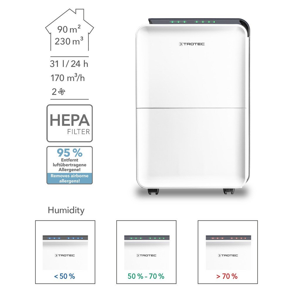 Itin efektyvus sprendimas patalpos klimato gerinimui: sumažinamas drėgmės kiekis iki 31 litro per dieną ir 95 % užtikrinamas oro valymas HEPA filtru, apsaugančiu nuo pelėsių, bakterijų, virusų, dulkių, žiedadulkių ir alergenų.