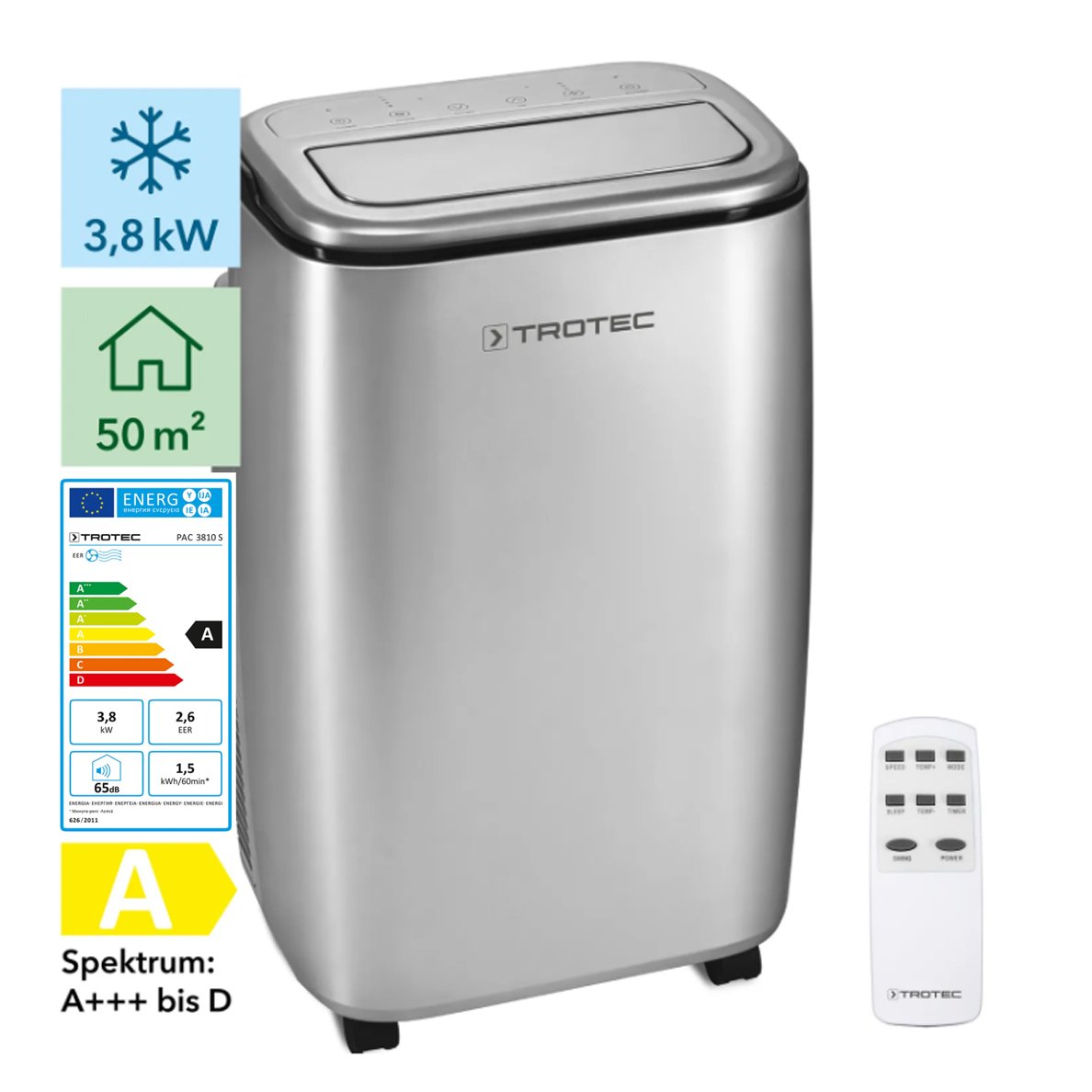 Stilingas mobilus oro kondicionierius Trotec PAC 3810 S leis mėgautis komfortiška kambario temperatūra ištisus metus. Oro kondicionierius Trotec PAC 3810 S greitai ir efektyviai vėsina karštomis vasaros dienomis, todėl galėsite mėgautis atvėsinta 16-31°C kambario temperatūra sunaudodami tik 3,8 kW elektros energijos. Šis oro kondicionierius puikiai atliks savo funkcijas namuose, biuruose, verslo patalpose, sodo nameliuose, viešbutyje, restorane, dirbtuvėse, galerijose, gydytojų kabinetuose, kurių plotas yra iki 50 m² / 125 m³ . Siekdami sumažinti patiriamas elektros energijos sąnaudas, įrenginys užtikrina ekonomišką veikimą – išjungiama vėsinimo funkcija automatiškai pasiekus iš anksto nustatytą temperatūrą. Tai reiškia, kad įrenginys vėsins tik tada, kai bus viršyta norima temperatūros vertė.