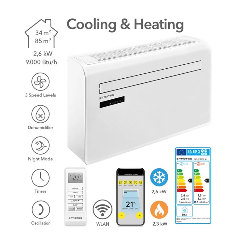 Trotec PAC-W 2650 SH monoblokas pasižymi itin dideliu našumu, greitai atvėsinantis arba šildantis patalpą iki 34 m2 ploto. Taip pat, sieninis oro kondicionierius gali būti naudojamas kaip sausintuvas arba ventiliatorius su išjungta vėsinimo ar šildymo funkcija. Šis kondicionierius turi 2 ortakius, skirtus tiekti šviežią orą iš lauko į kambarį bei išleisti šilumą į išorę. Dar daugiau, plaunamas oro filtras, naktinis režimas, laikmatis, automatinis režimas leis mėgautis malonia vėsuma nereikalaujant sudėtingo valdymo ar ypatingos priežiūros.