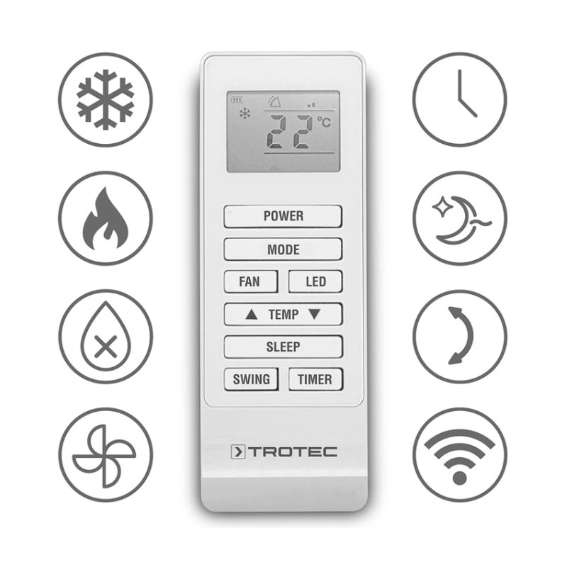 Sieninis oro kondicionierius PAC-W 2650 SH gali būti valdomas nuotoliniu būdu. Tereikia parsisiųsti mobiliąją programėlę "Trotec" iš Google Play arba Apps store parduotuvių ir galėsite realiu laiku su išmaniuoju įrenginiu valdyti patalpos oro klimatą iš bet kurios vietos. Taip pat galite prijungti ir prie namų valdymo sistemos ar valdyti nuotolinio valdymo pulteliu.